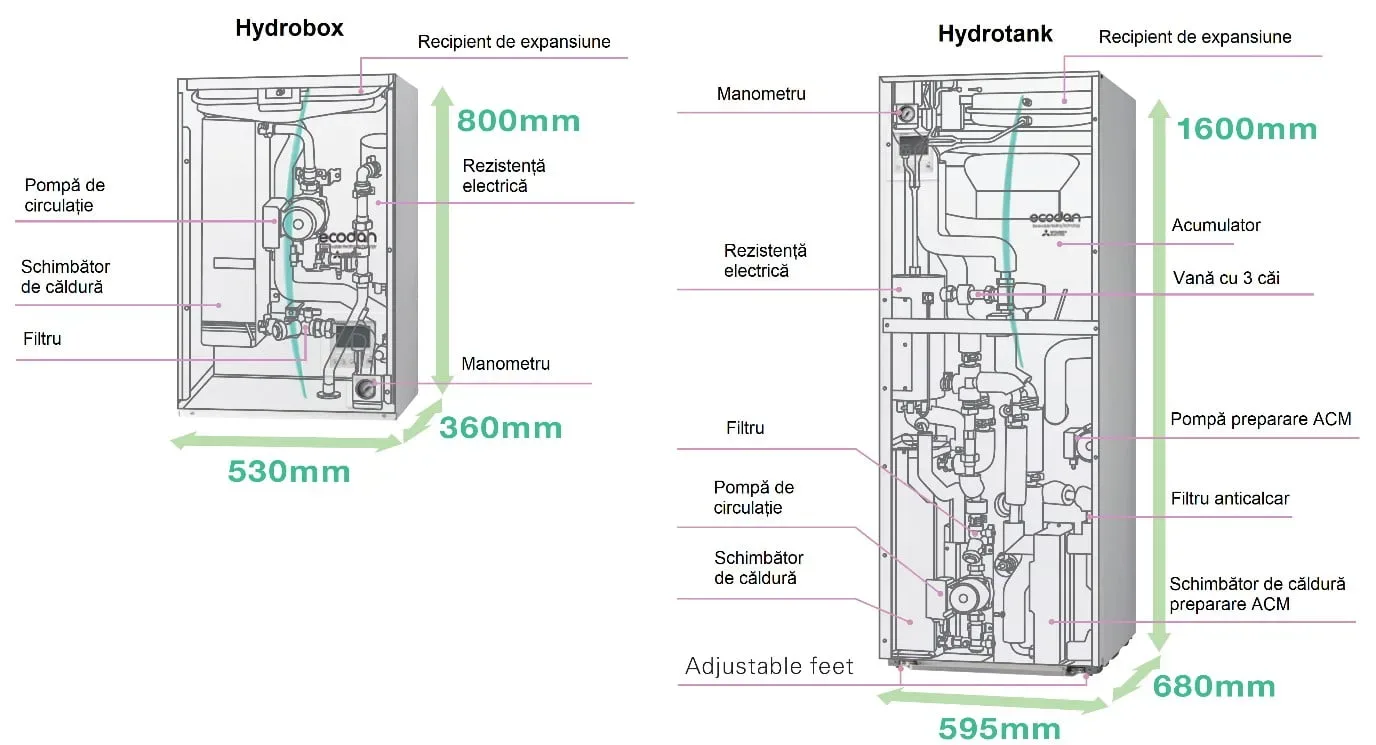 Hydrotank-ul contine toate elementele necesare sistemului hidraulic(schimbator de caldura, vas de expansiune, interfata, manometru presiune apa, supapa de siguranta si pompa de recirculare) . Hydrotank-ul poate fi conectat la incalzirea in pardoseala, ventiloconvectori sau calorifere. Hydrotank-ul Mitsubishi Electric Ecodan are incorporat un boiler de 170 de litri.
